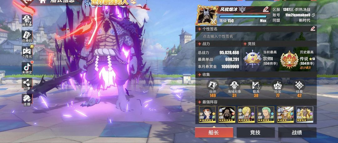 【官方】9500万战力全角色和之国霍金斯_炎帝萨博_新路奇_鬼岛路飞_十字老沙_二98神力租前看描述