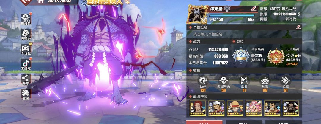 【官方】一亿战力全角色和之国霍金斯_炎帝萨博_cp0路奇_鬼岛路飞_十字老沙三98神力租前看号主描述