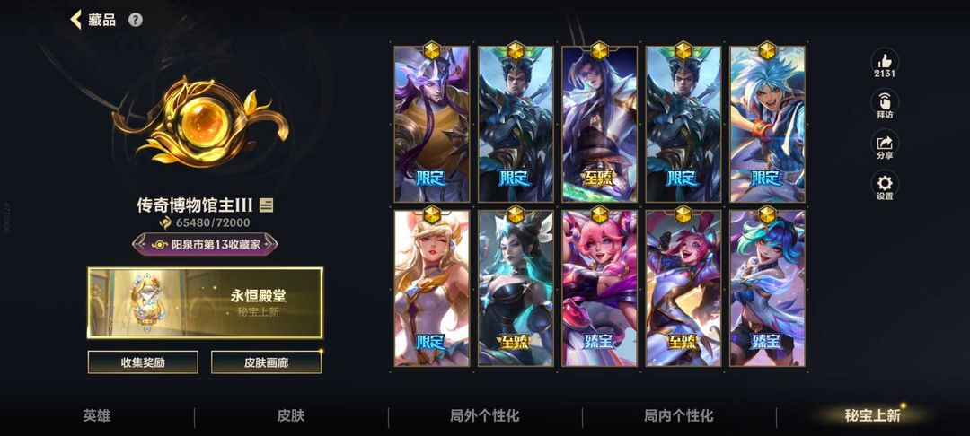 装备描述:臻宝幻灵格温/至臻星守辛德拉/至臻喵喵金克斯/灰烬骑士派克/神话卡牌皇子等/兰亭序不含至臻/情人节全套