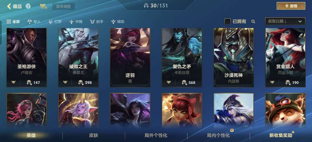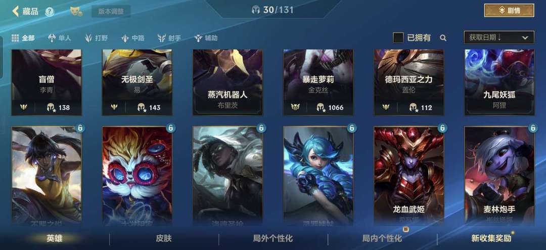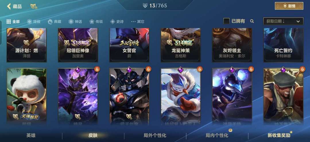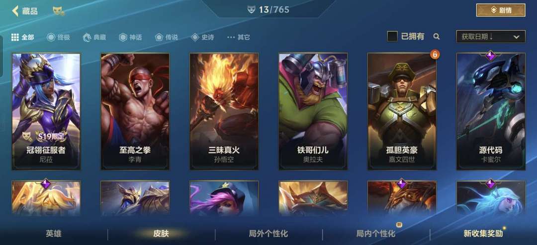 装备描述:新赛季铂金,源计划泽丽,源计划青钢影,三昧真火孙悟空,13皮肤,30英雄