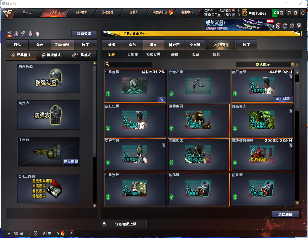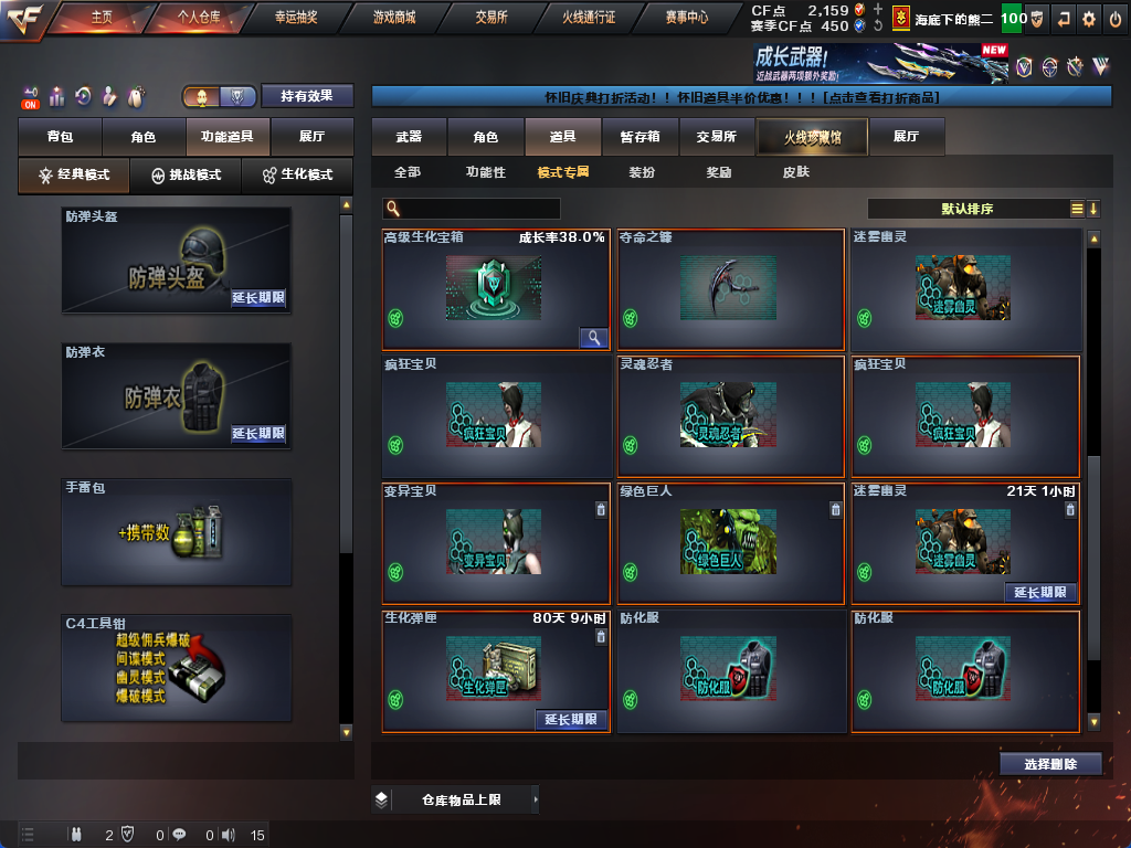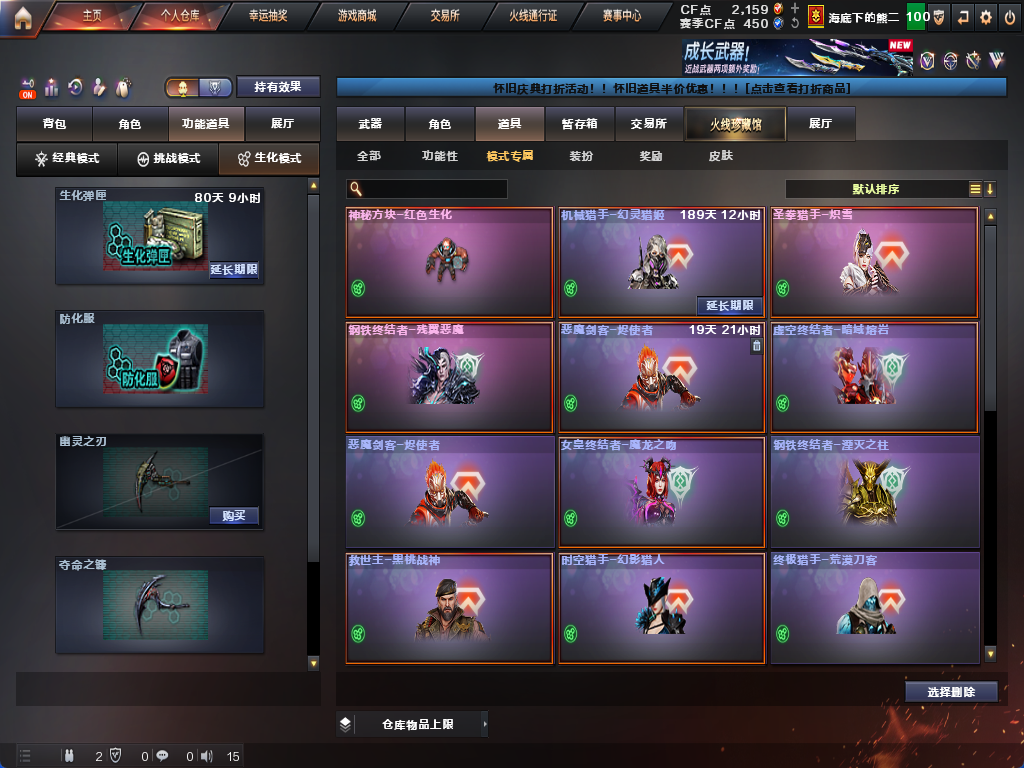 生化炽芒蝶刃♉时空猎手♉16个生化皮肤♉毒蜂斯泰尔死亡♉幻神炼狱可排位♉四防生化背包满榴弹无6盘6烈