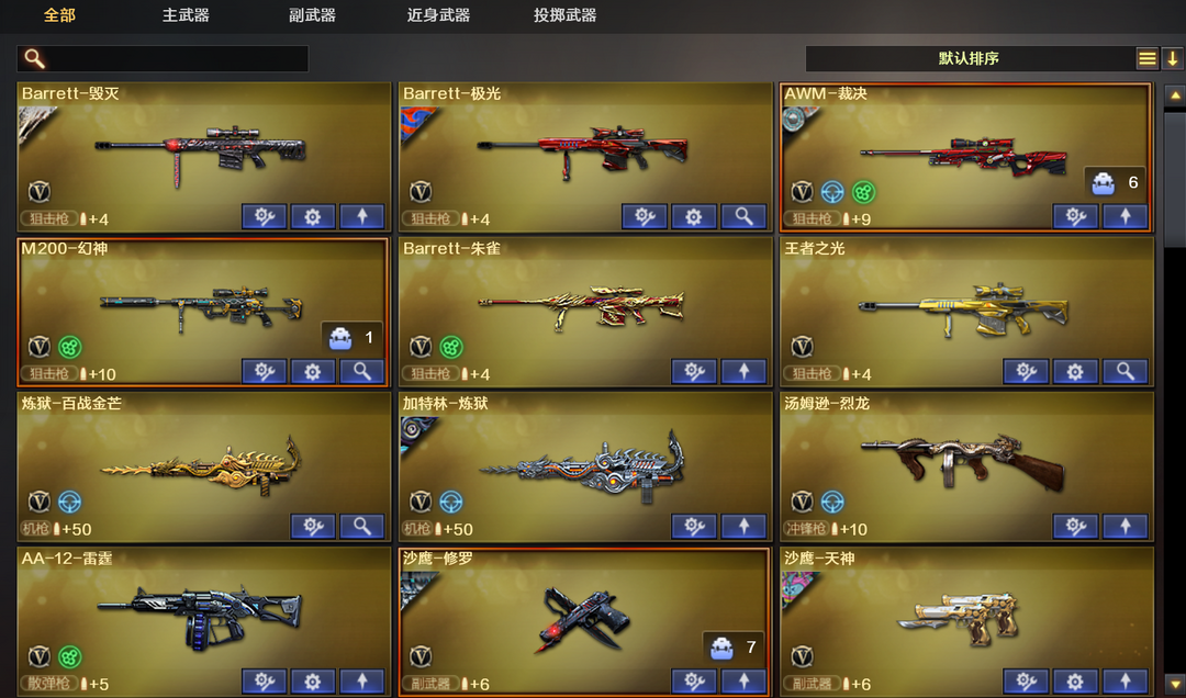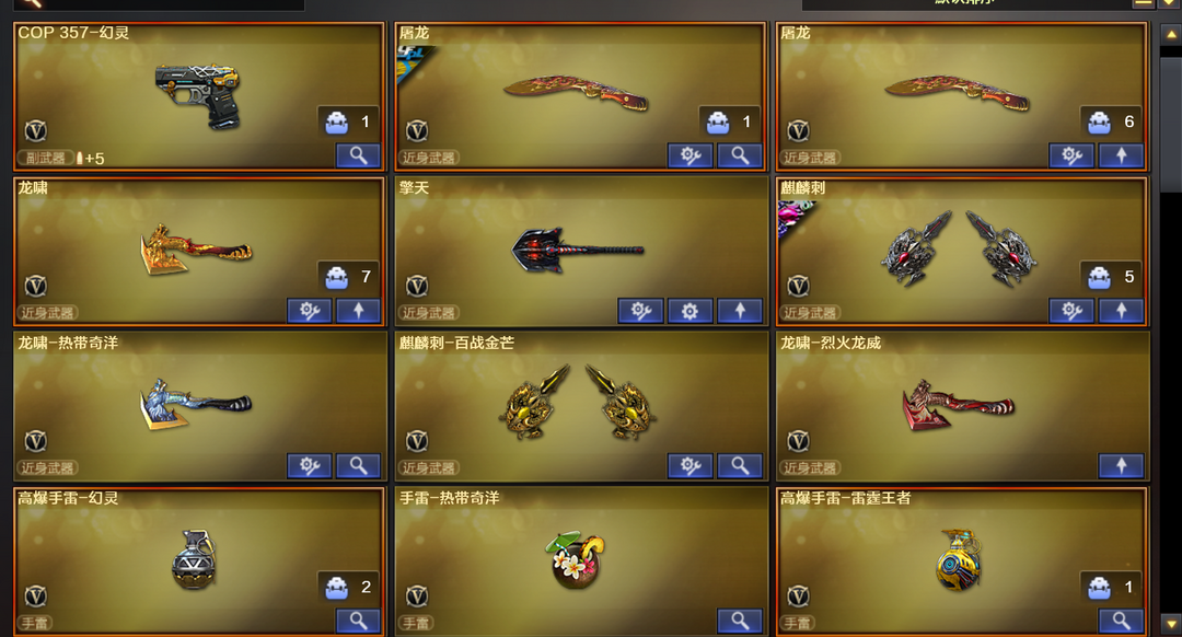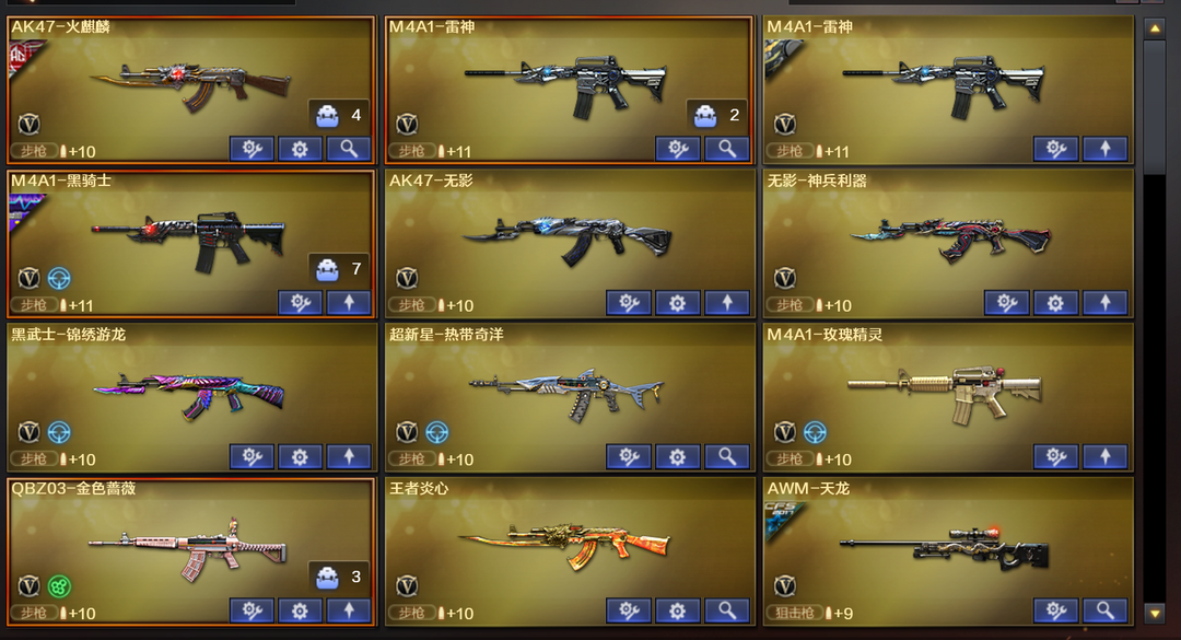 装备描述:王者武器:王者炎心-觉醒版;高爆手雷-雷霆王者;烟雾弹-雷霆王者-觉醒版;王者之光-觉醒版;炫金天龙;王者之锋;王者之刺;炫金修罗;炫金毁灭;炼狱-悦蓝 英雄武器:M4A1-雷神;超新星-热带奇洋;龙啸-热带奇洋;闪光弹-云龙;QBZ03-金色蔷薇;手雷-热带奇洋;黑武士-锦绣游龙;沙鹰-修罗;M200-幻神;闪光弹-幻灵;烟雾弹-幻灵;高爆手雷-幻灵;COP 357-幻灵;龙啸-烈火龙威;无影-神兵利器;麒麟刺;AK47-火麒麟;M4A1-玫瑰精灵;加特林-炼狱;Barrett-毁灭;AWM-裁决;AK47-无影;AWM-天龙;AA-12-雷霆;汤姆逊-烈龙;M4A1-黑骑士;Barrett-朱雀;屠龙;Barrett-极光;龙啸;擎天;沙鹰-天神 角色:炫;飞虎队;黑鹰;幻影;雷霆-β;波塞冬;复仇者;堕天使;王者-零;兰;夜玫瑰;威锋;陈龙野;陈龙野-X;陈龙野-Y;娜塔莎;救世复仇;救世主;精英部队;灵狐者;烈锋;王力宏;妩媚妖姬;影武者;影武者-X;雷豹;救世主-X;蜀雪;潜龙队-X;暗夜-X;青霞仙子;王者春;娟娟;紫霞;夜玫瑰-X;麻雀;剑齿虎-X;虎妞;潘多拉-甜心教官