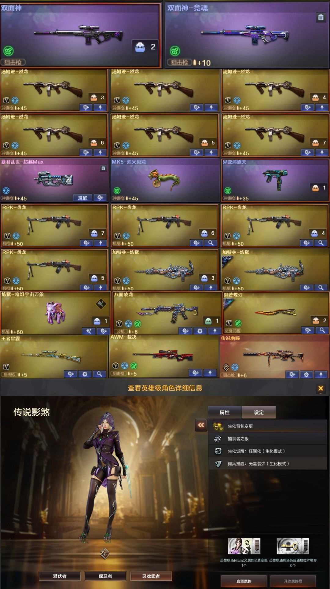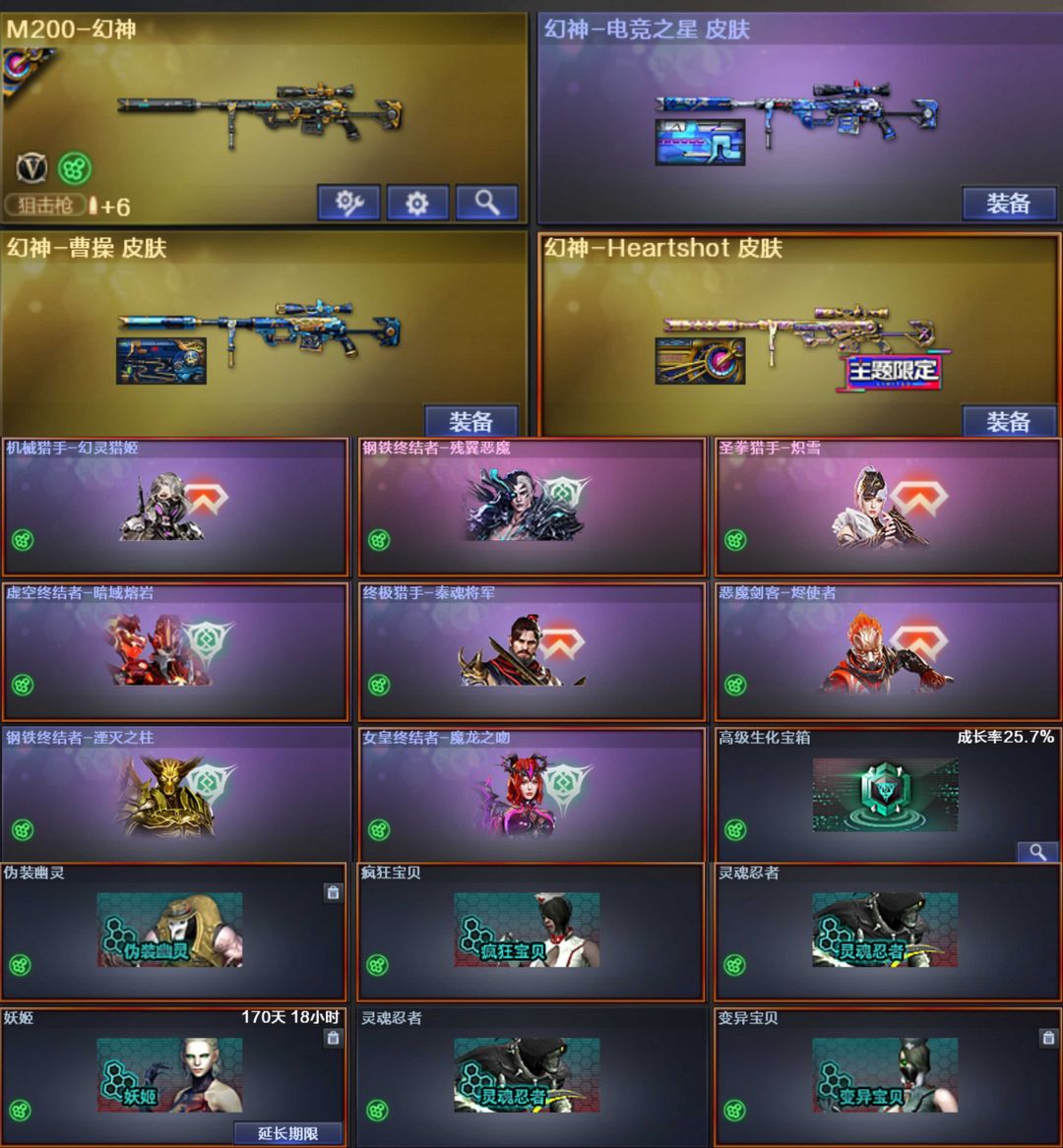 炼狱泡泡象/影煞八面玲珑蝴蝶刀/传说幽瞳/六盘六烈清道夫/七猎手皮/幻神三皮/全弹夹