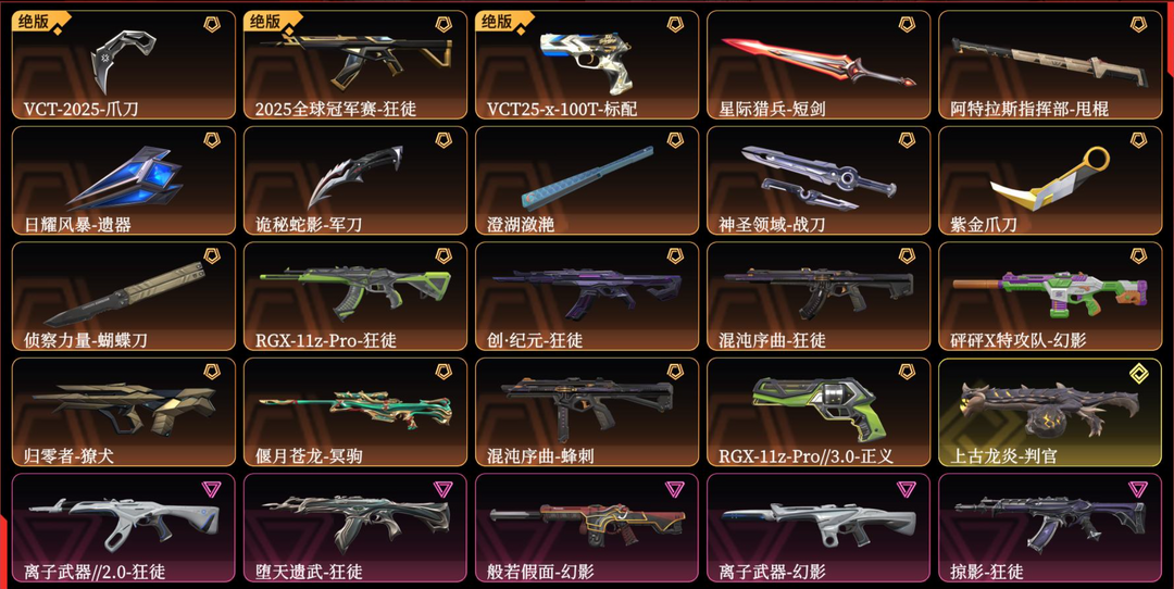 可排位大库存☆25AK☆VCT爪刀☆混沌☆RGX☆苍龙☆创纪元☆龙炎☆归零者☆掠影☆侦察☆离子☆紫金