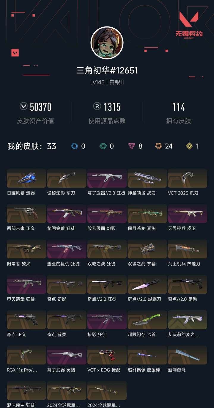 装备描述:可排位 炸鱼别炸太狠了 不然极其容易封号 刀:VCT爪刀 显卡爪刀 太极扇 奇点蝴蝶刀2024全球冠军赛直刀 正义:奇点正义 西部未来正义 狂徒:盖亚的复仇 混沌序曲 紫金狂徒 猫猫AK (艾沃莉的梦之翼)离子武器狂徒 双城之战AK 奇点AK 标配: 2024EDG标配 大狙:偃月苍龙大狙 离子大狙 幻影:2024全球冠军赛幻影 恶鬼般若假面幻影 奇点幻影 鬼魅:奇点鬼魅 斗牛犬:归零者 戍卫:天界戍卫
