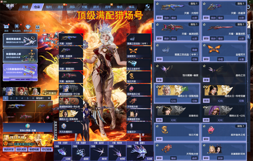 猎场顶配✅涅槃传奇女王三头金蛇霜霆战盔✅五核天耀套天穹裁决者圣翼魅影双淑✅影戍鳄鱼三臂铠龙曦