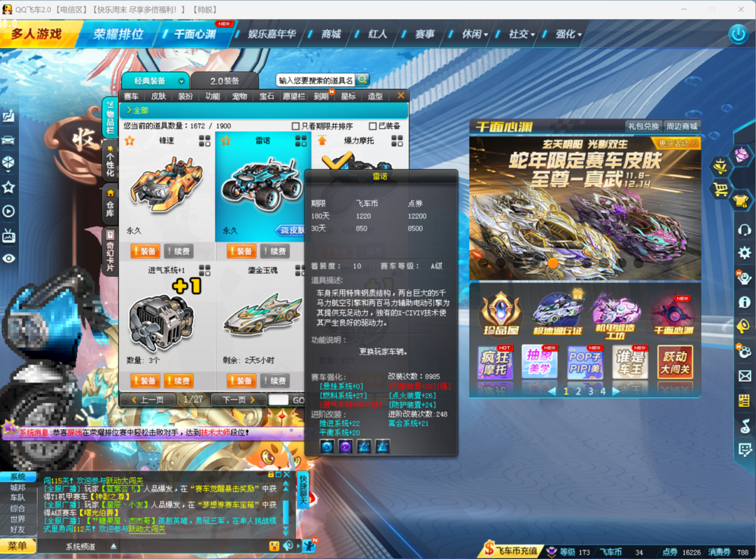 装备描述:冻结重上 电信区永久S车锋速 双四级宝石改装29 永久雷诺等车