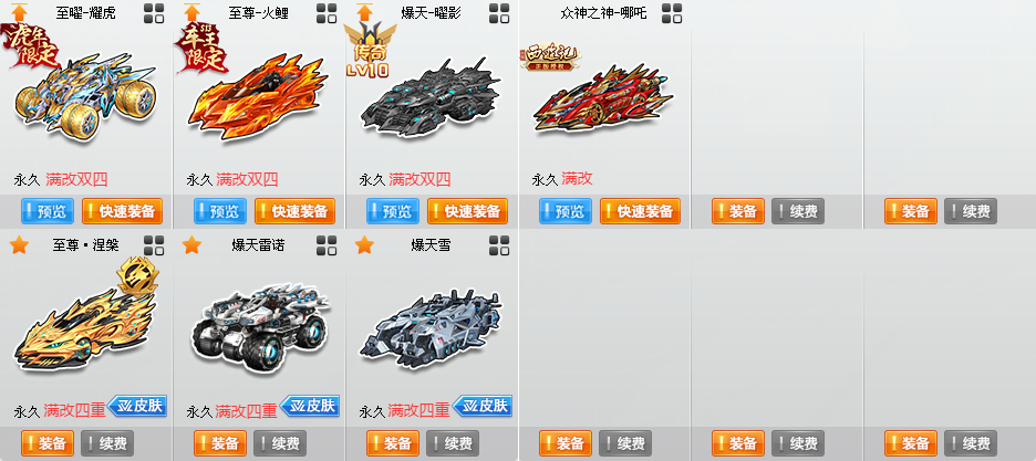 限制: 撤单率<70%才可租用此帐号装备描述:〓S〓7辆〓至曜影虎-耀虎、黑曼巴-至尊火鲤、爆天甲-曜影10阶、至尊涅槃、爆天雷诺、爆天雪、众神之神-哪吒 〓A〓10辆〓魔王雷诺 〓骑宠〓1只〓游鸿蓝鲸+10 〓其他〓2W魅力、800W荣誉、紫钻6、皇族5 〓女〓30页套装〓 〓男〓30页套装〓