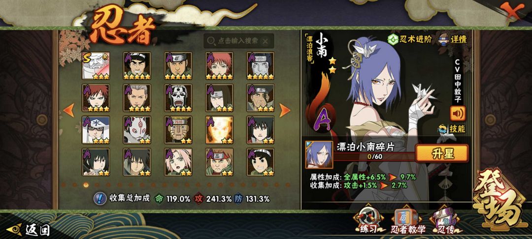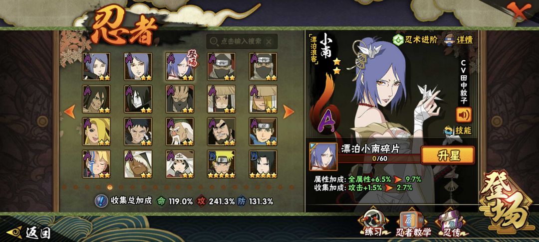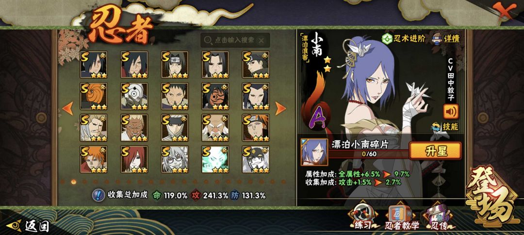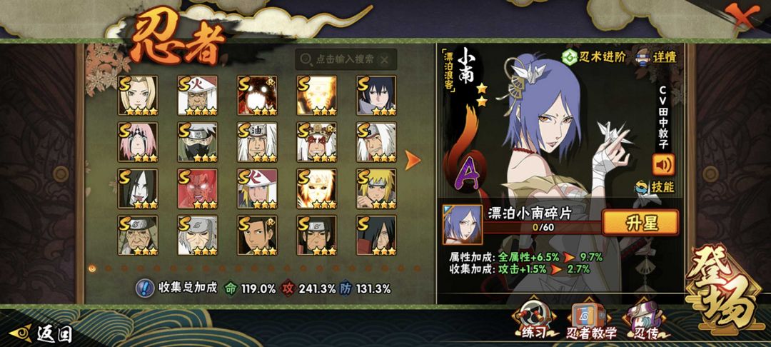 装备描述:有熊猫,螃蟹,二尾。有狂野鲛鲨时装,还有多个忍法帖和198忍者。