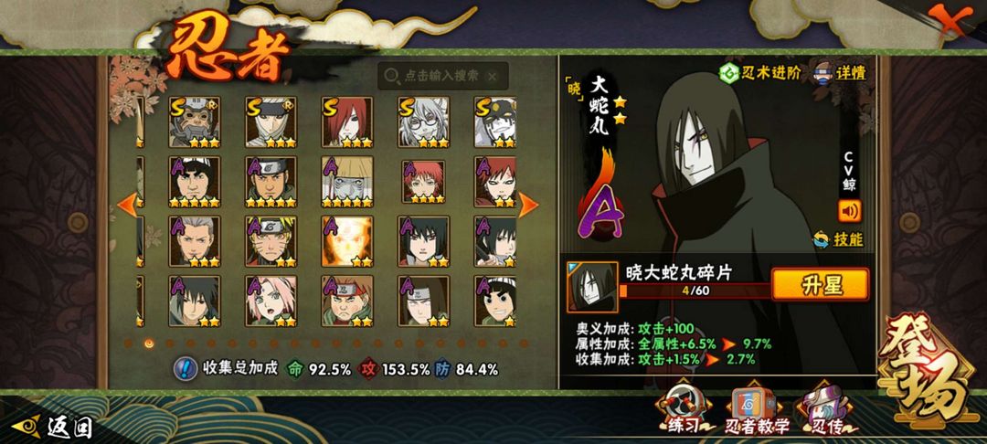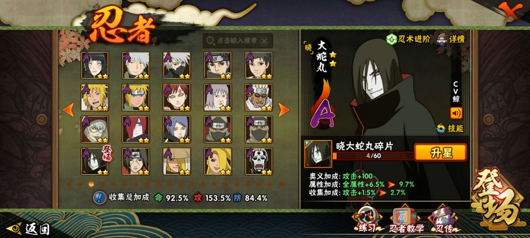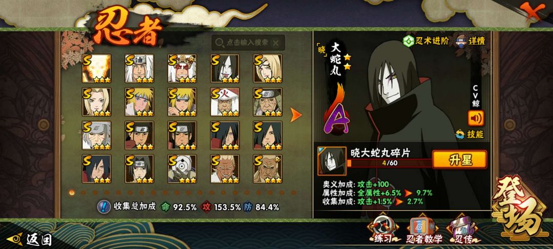 老忍者基本上都有,千万战力,有熊猫,蛞蝓等2个98通灵兽
