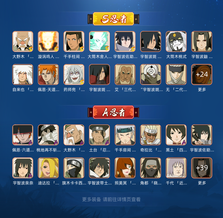 装备描述:40s,55A,284忍,五影斑,惊门凯,漂泊带土,佐助,扉间,小南,佩恩,2110w战,熊猫螃蟹二尾万蛇,可打段位