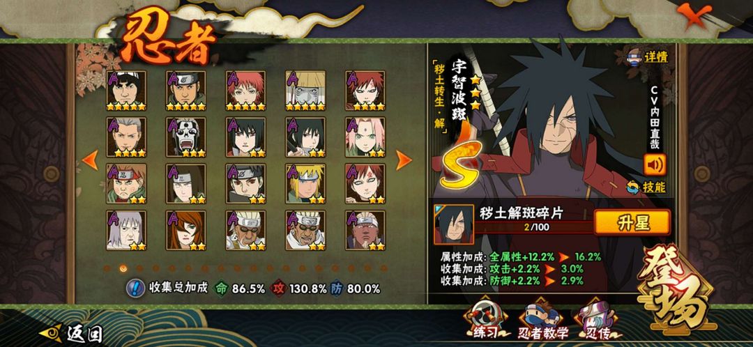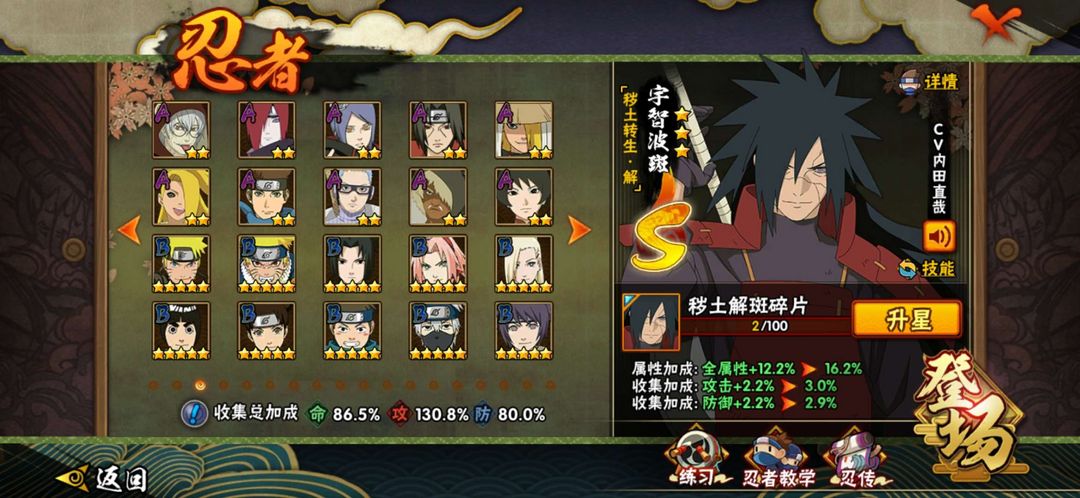 装备描述:27S 44A 220忍者 蝎 「绯流琥」/宇智波带土 「漂泊浪客」/神秘面具男 「红夜之刃」/宇智波斑 「秽土转生·解」/自来也 「传说中的三忍」/漩涡鸣人 「九喇嘛连结」/宇智波斑「白面具」/宇智波带土「忍界大战」/宇智波佐助 「永恒万花筒」/佩恩·天道「超」/旗木卡卡西 「须佐能乎」/波风水门 「九喇嘛连结」