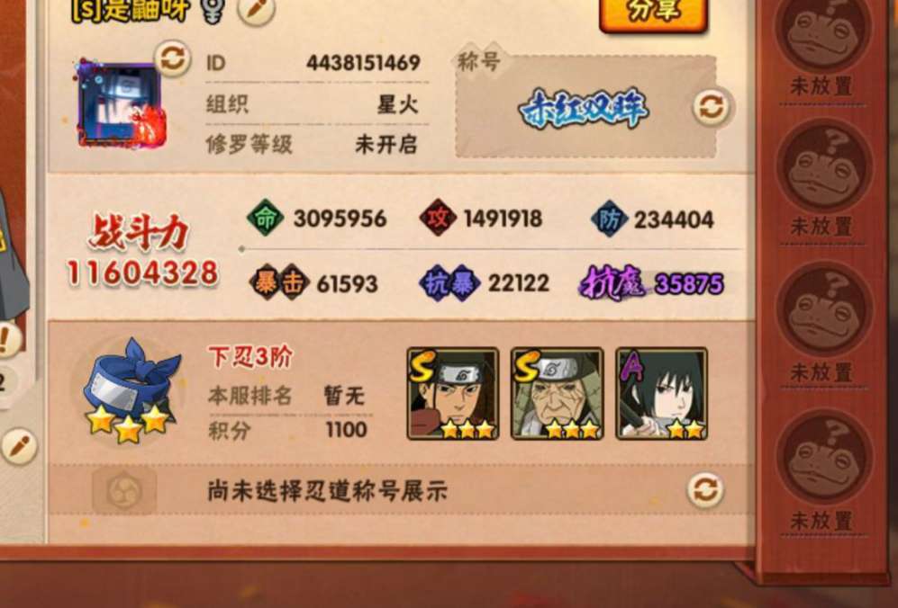 装备描述:可打排位 5星须佐鼬可带团本 秘境 1160w战力149w攻击 忍具四怒,3查克拉可大招接大招 喜欢本账号请点 ☆收藏☆ 方便下次租用,谢谢光临惠顾!