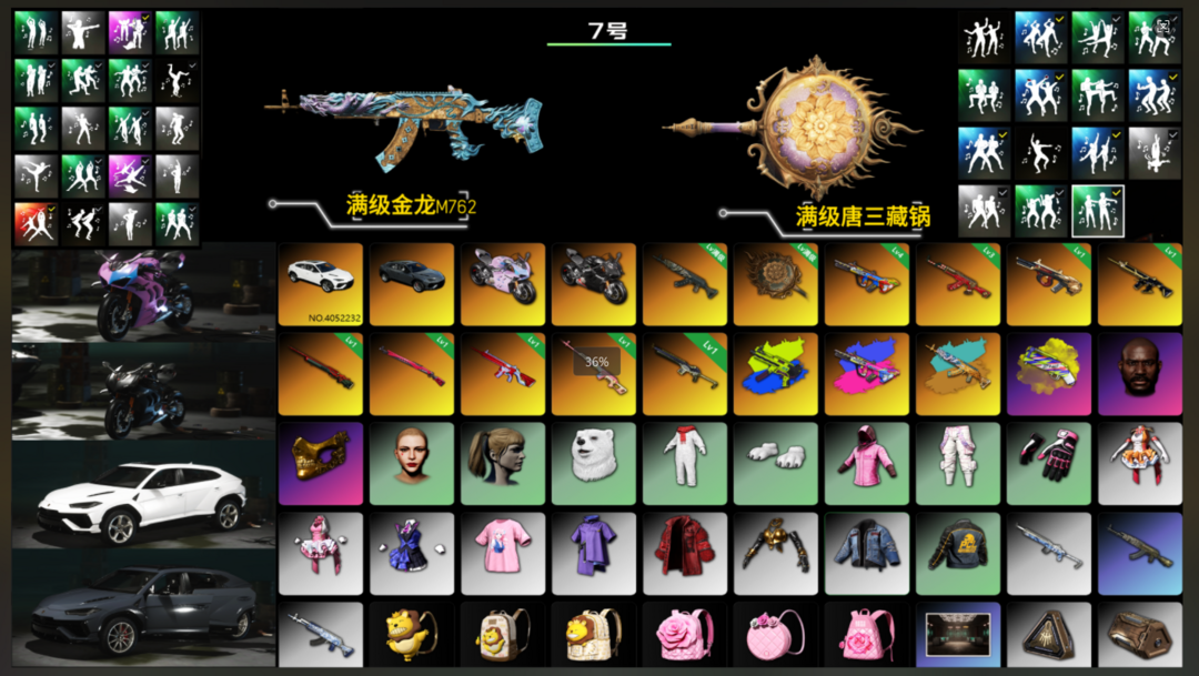 【2满级12神器】兰博-杜卡迪-满级金龙-满级唐三藏锅-⑥异色爆裂AUG-③圣诞AKM-弥诺AUG-