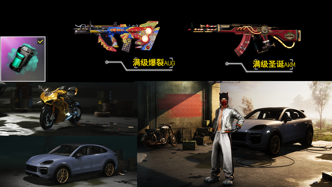 【2满级】禁排⭐保时捷SUV⭐杜卡迪⭐瀚娜⭐满级爆裂弹球AUG⭐满级圣诞AKM⭐青色烟雾弹⭐猩红M2