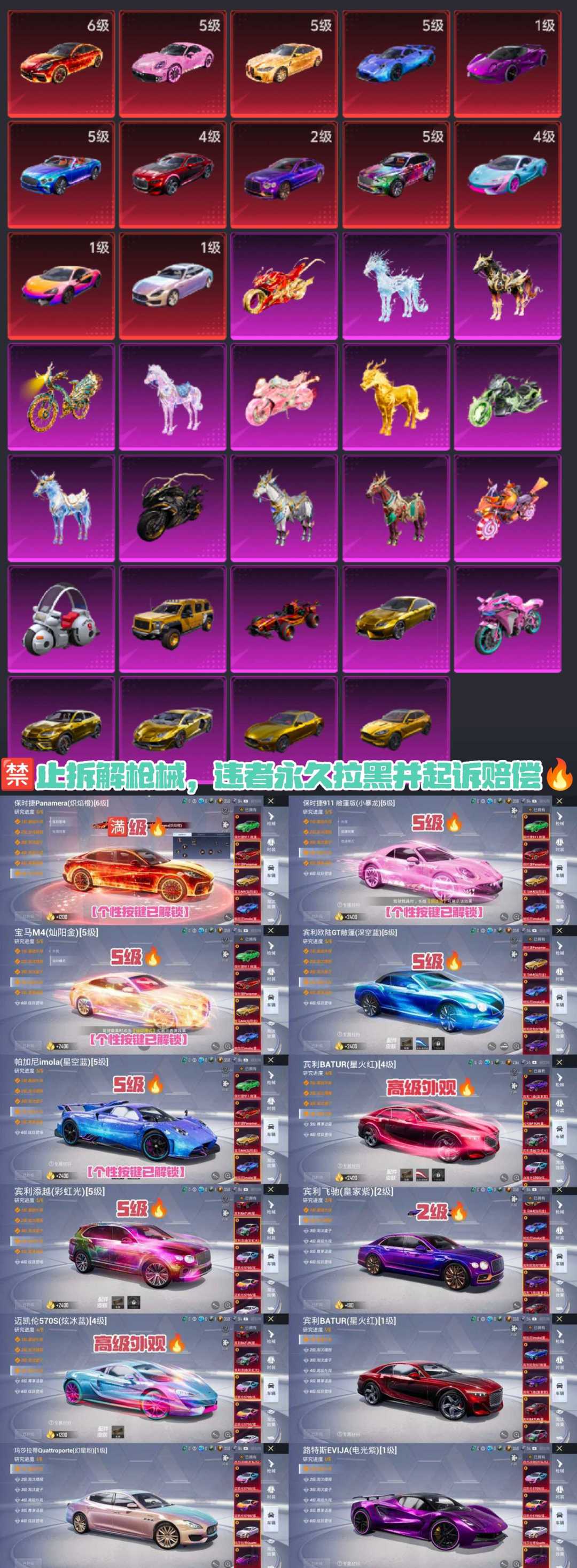 限制: 租号15次及以上 | 撤单率<30%才可租用此帐号装备描述:❤️拆解枪械载具永久拉黑,如果装备与图片描述不符请撤单,不要去拆解。 ❤️订单由平台客服处理,商家和号主无权处理,有问题咨询平台客服。 ⭐账号价值高,累计充值几十万,如开挂或使用第三方造成封号,按累计充值金额起诉赔偿,打官司追究到底。 ⭐⭐注意事项: 1、拆解枪械拉黑处理并上报封停平台账号!!! 2、禁止伤害队友、频繁逃跑游戏,违者永久拉黑。 3、如造成禁麦禁言,拉黑处理,请文明游戏。 ❤️温馨提示: 感谢各位老板的支持!!!协助登录后不跳转到游戏,可能是延迟,请手动去游戏登录界面查看有无登录。如果没登录,请关闭和平精英重新打开更新后再重新协助登录。