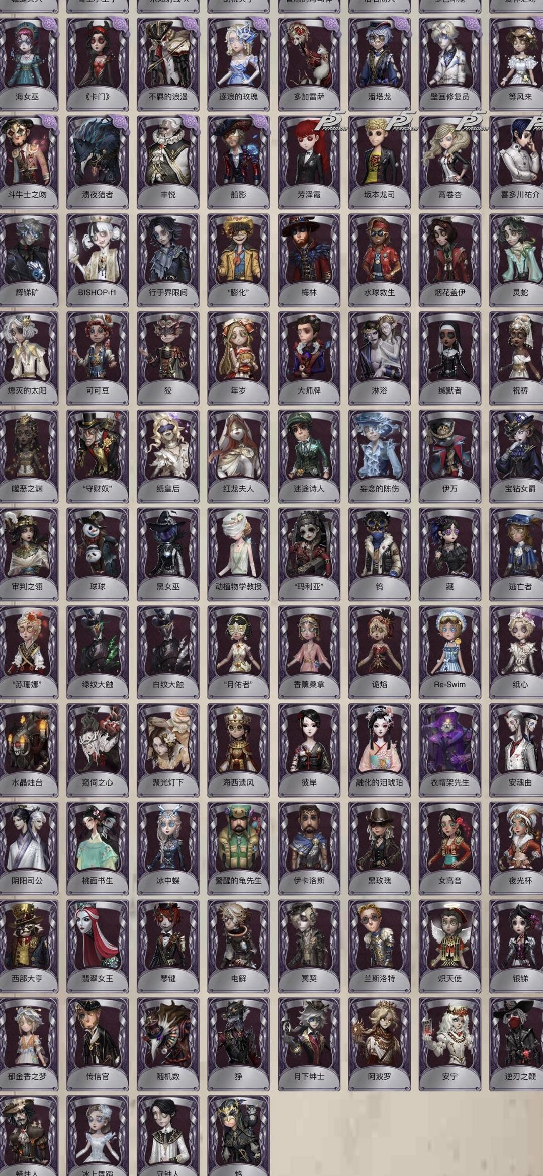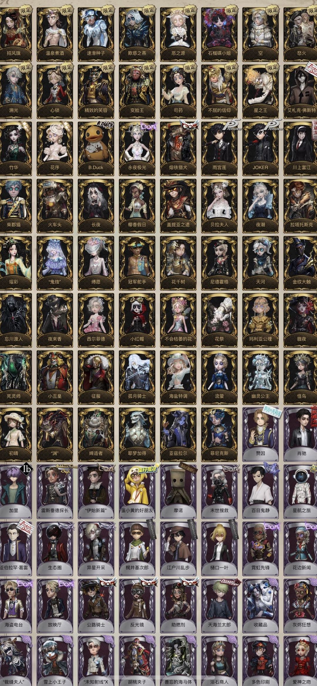 装备描述:【禁言】标题和描述里有的皮肤都有不要在意图鉴我懒得更新。金的数量等于皮肤加挂件的数量。万一好友满了或者你自己加满了不作为退款理由! 时装共享石榴蝶小姐 天河 招风旗 百目鬼静 盖提亚之遗 星航之旅 花祭 椰香假日 艾扎克 艾扎克礼包 拒刃匕首 竹华 花序 B.Duck 永夜极光 熔铁猎犬 温泉煮酒 速滑种子 欺惑之燕 恶之源 空 怒火 心锁 精致的笑容 小丑新年限定 不屈的信仰 柴郡猫 火车头 长夜 贝拉夫人套 拉塔托斯克 征服 尼德霍格 忘川渡人套 夜来香 小红帽 不会枯萎的花 死灵师 小丑皇 孤月骑士 海盐特调 流萤套 幽灵公主 渊 缔造者 亚兹拉尔 菲尼克斯 紫皮:生态圈 异星开采 梶井基次郎 江户川乱步 樋口一叶 霓虹先锋 花边新闻 海盗电台 放映厅 公路骑士 反光镜 助燃剂灰烬狂想 雪上小王子 胡桃夹子 浴石商人 海女巫 卡门 壁画修复员 等风来 梅林 烟花盖伊 可可豆 狡 年岁 大师牌 淋浴 守财奴 纸皇后 红龙夫人 伊万 宝钻女爵 球球 动植物学教授 玛利亚 藏 苏珊娜 绿纹大触 白纹大触 月佑者 Re Swim 狰 水晶烛台 窥伺之心 海西遗风 彼岸 安魂曲 阴阳司公 冰中蝶 伊卡洛斯 黑玫瑰 女高音 西部大亨 翡翠女王 电解 炽天使 传信官 命运轮盘 月下绅士 阿波罗 冰上舞蹈 守钟人 鸩。 部分挂件:宽恕 萤之羽 无尽森林 完美人偶 致命的邀请函 梦魇结晶 噬魂 园丁布偶 猎人的箭囊 厌离 呼唤