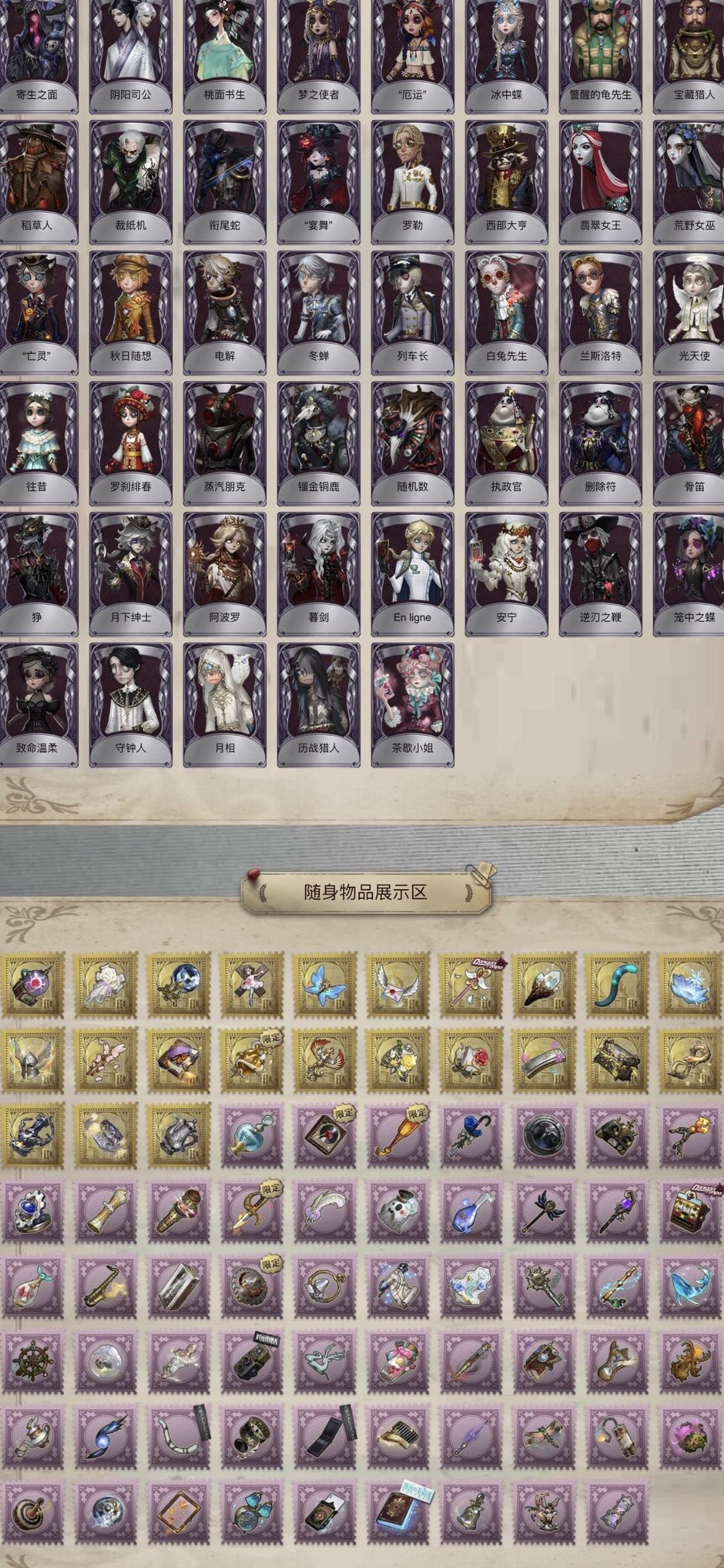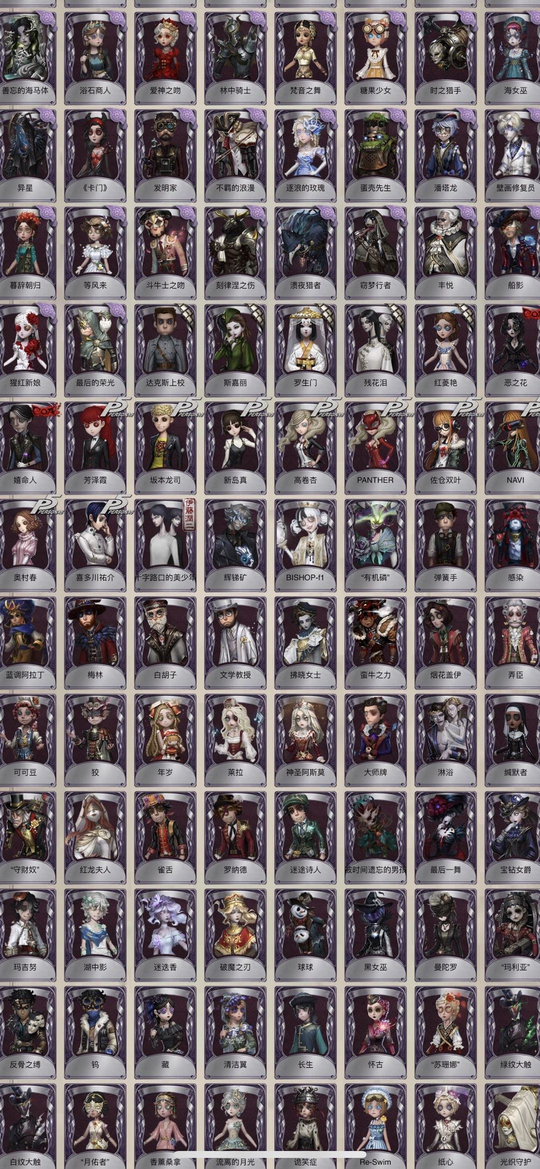 装备描述:全角色恒梦 溯光 花千树 西尔菲德 柴郡猫 鬼烛 新岛真 奥村春 明智吾郎 坂本龙司 Joker 冠军舵手 玛利亚公理 赤松枫 川上富江 忘川渡人盖提亚之遗最原终一 星空之翼椰香假日 迷雾山庄 红夫人全金皮 竹华 B.Duck 伊莎贝拉 熔铁猎犬 雨宫莲 白泽套 典狱长 大英雄 赤宴 菖蒲 惊鸿 精致的笑容 小丑新年限定金 总裁判长 不屈的信仰 茶话会 长夜星辰 贝拉夫人套 夜潮套 拉塔托斯克 尼德霍格 金纹大触 夜来香套 花祭 流萤套 渊 缔造者 今夜不再套 菲尼克斯 紫皮:线控信号 江户川乱步 程小时陆光 时光代理人 逆位审判 B.Duck潮 可妮兔 花边新闻 海盗电台 报纸怪客 盲区 吉尔达 诺曼 公路骑士 苗木诚 七海千秋 缚咒法老 沉眠的兔先生 雪原猎人 雪上小王子 胡桃夹子 浴石商人 林中骑士 梵音之舞 糖果少女 窃梦行者 时之猎手 海女巫 异星 卡门 发明家 蛋壳先生 壁画修复员 暮辞朝归 等风来 刻律涅之伤 猩红新娘 最后的光荣 斯嘉丽 罗生门 残花泪 红菱艳 恶之花 嬉命人 高卷杏 PANTHER 佐仓双叶 NAVI 喜多川祐介 十字路口的美少年 光学镜面 真相小姐 阿拉丁 DM 时之砂 弹簧手 感染 梅林 白胡子文学教授 雀舌 罗纳德 迷途诗人 蛮牛之力 烟花盖伊 弄臣 可可豆 狡 年岁 莱拉 大师牌 淋浴 缄默者 守财奴 红龙夫人 被时间遗忘的男孩 最后一舞 宝钻女爵 玛吉努 迷迭香 球球 黑女巫 曼陀罗 玛利亚 藏 长生 怀古 苏珊娜 绿纹大触 白纹大触 月佑者 诡笑症 骨笛 狰 光织守护 甜心蛋糕 海西遗风 不愿醒来的女孩 紫孔雀 波塞冬 寄生之面 阴阳司公 梦之使者 厄运 冰中蝶 警醒的龟先生 宝藏猎人 稻草人 衔尾蛇 宴舞 罗勒 西部大亨 翡翠女王 荒野女巫 亡灵 秋日随想 电解 冬蝉 列车长 白兔先生 兰斯洛特 往昔 罗刹绯春 蒸汽朋克 命运轮盘 月下绅士 阿波罗 暮剑 En ligne 逆刃之鞭 笼中之蝶 致命温柔 守钟人 月相 历战猎人 湖中影 耶梦加得 部分挂件:雷电生成器 玫瑰之下 诅咒黑云 完美人偶 萤之羽 致命的邀请函 兔美的魔法棒 梦魇结晶 猫尾 雪莲 逆转之战 厌离 书中蝶 仁慈 涅槃 黄玫瑰之骸 潘多拉 最后的馈赠 邪火宝箱 黑胶碟 焚火 蓝玫瑰手杖 断剑 紫Vote盒子 卡住的齿轮 时光相机