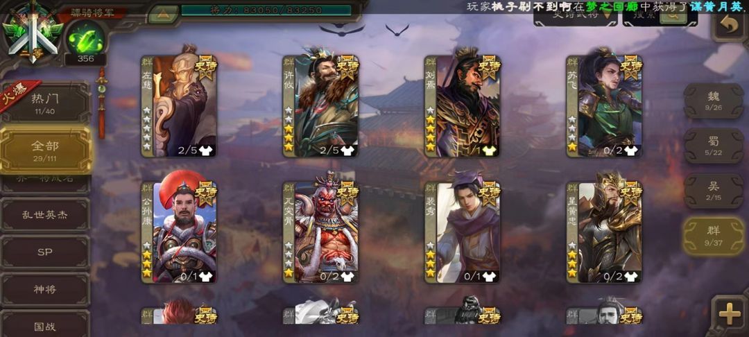 限制: 撤单率<80%才可租用此帐号装备描述:审配-祢衡-星黄忠-许攸-灵魂歌王留赞-马云禄-戏志才-神赵云-神吕布-