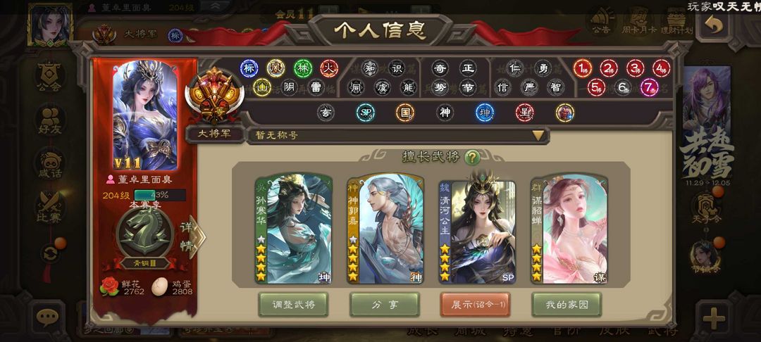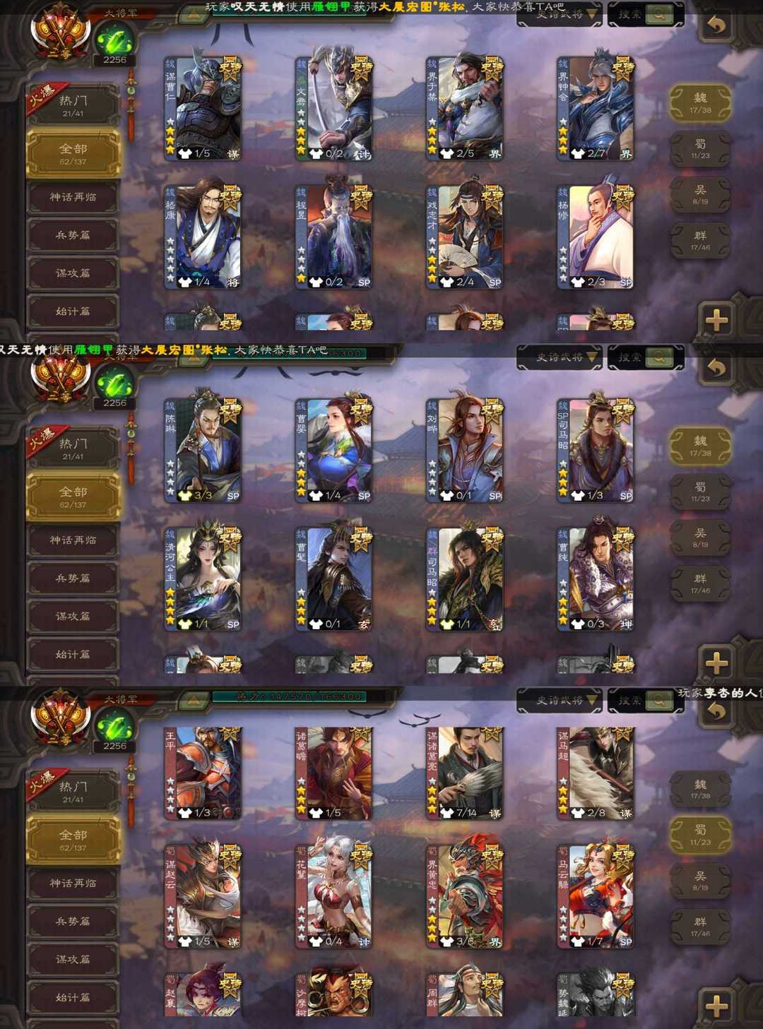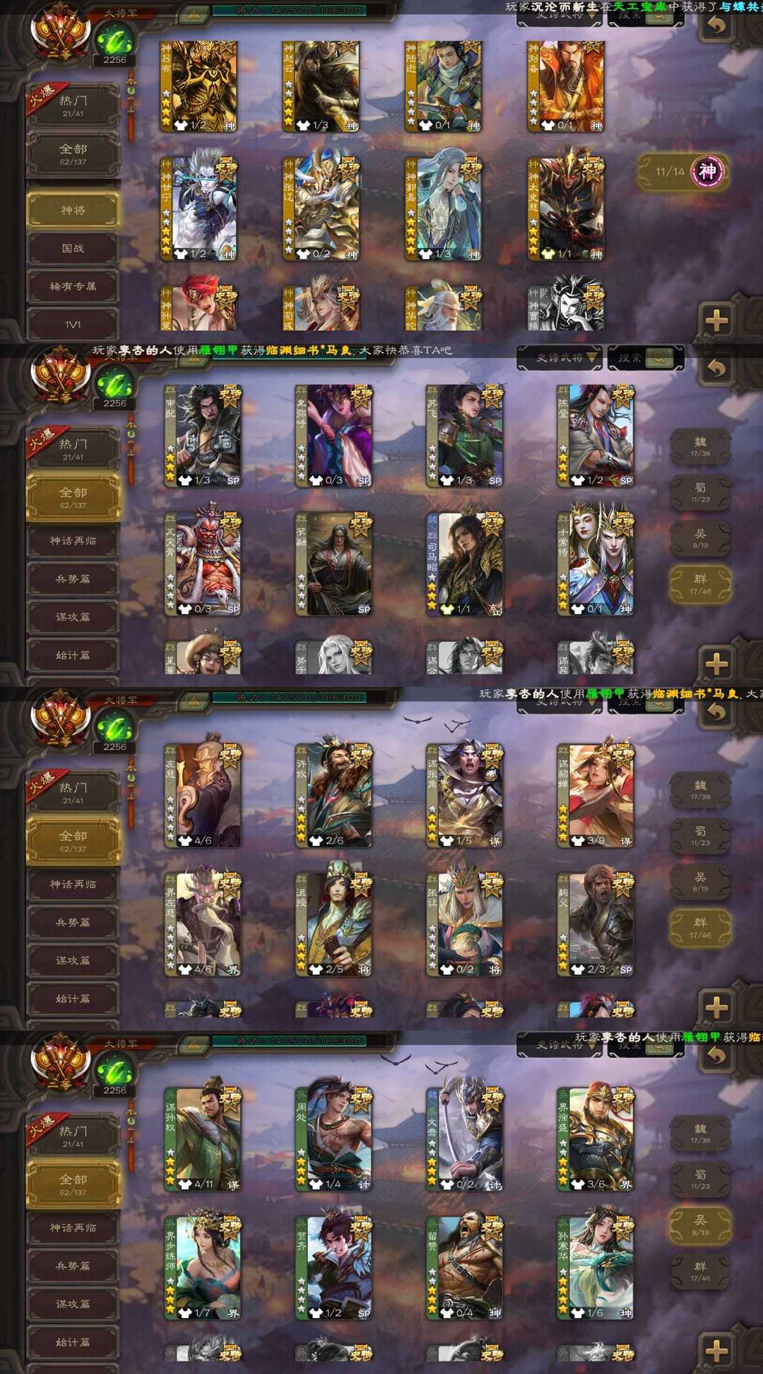 装备描述:【三卡过万】v11⚡动态神甘宁神郭嘉神荀彧⚡新笮融曹髦⚡十常侍⚡双形态界钟会⚡谋诸葛亮⚡孙寒华文鸯⚡ 魏:谋曹仁 文鸯 界于禁 界钟会 戏志才 曹婴 曹髦 清河公主 蜀:谋诸葛亮 谋马超 谋赵云 花鬘 吴:谋孙权 孙寒华 留赞 动态界徐盛 群:谋貂蝉 谋张角 十常侍 笮融 审配 界左慈 神:神甘宁 神郭嘉 神荀彧 神孙策 神华佗