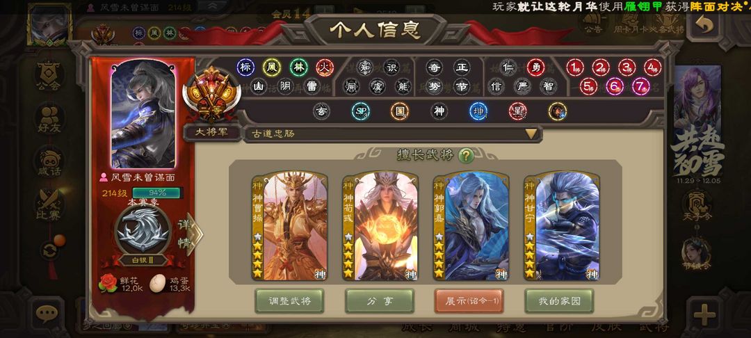 装备描述:【免费点将】v14⚡动态六巨头⚡文鸯谋曹丕双形态界钟会⚡谋诸葛亮谋刘备谋黄忠⚡天子令谋孙策⚡孙寒华界沮授杜预⚡ 魏:天子令谋曹丕 谋曹仁 双形态界钟会 曹婴 戏志才 马钧 蜀:谋刘备 谋诸葛亮 谋黄忠 吴:谋孙策 谋黄盖 孙寒华 文鸯 孙寒华 群:杜预 谋貂蝉 界沮授 刘焉徐荣 十常侍 南华老仙 神:神曹 神甘宁 神荀彧 神郭嘉 神孙策 神太史慈