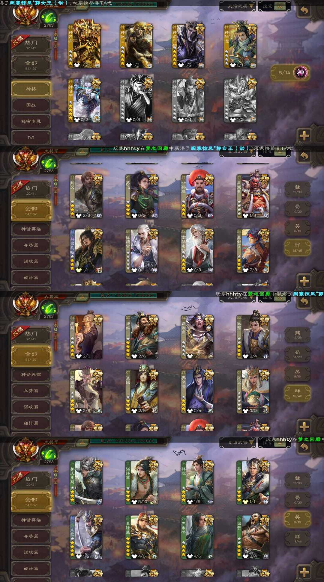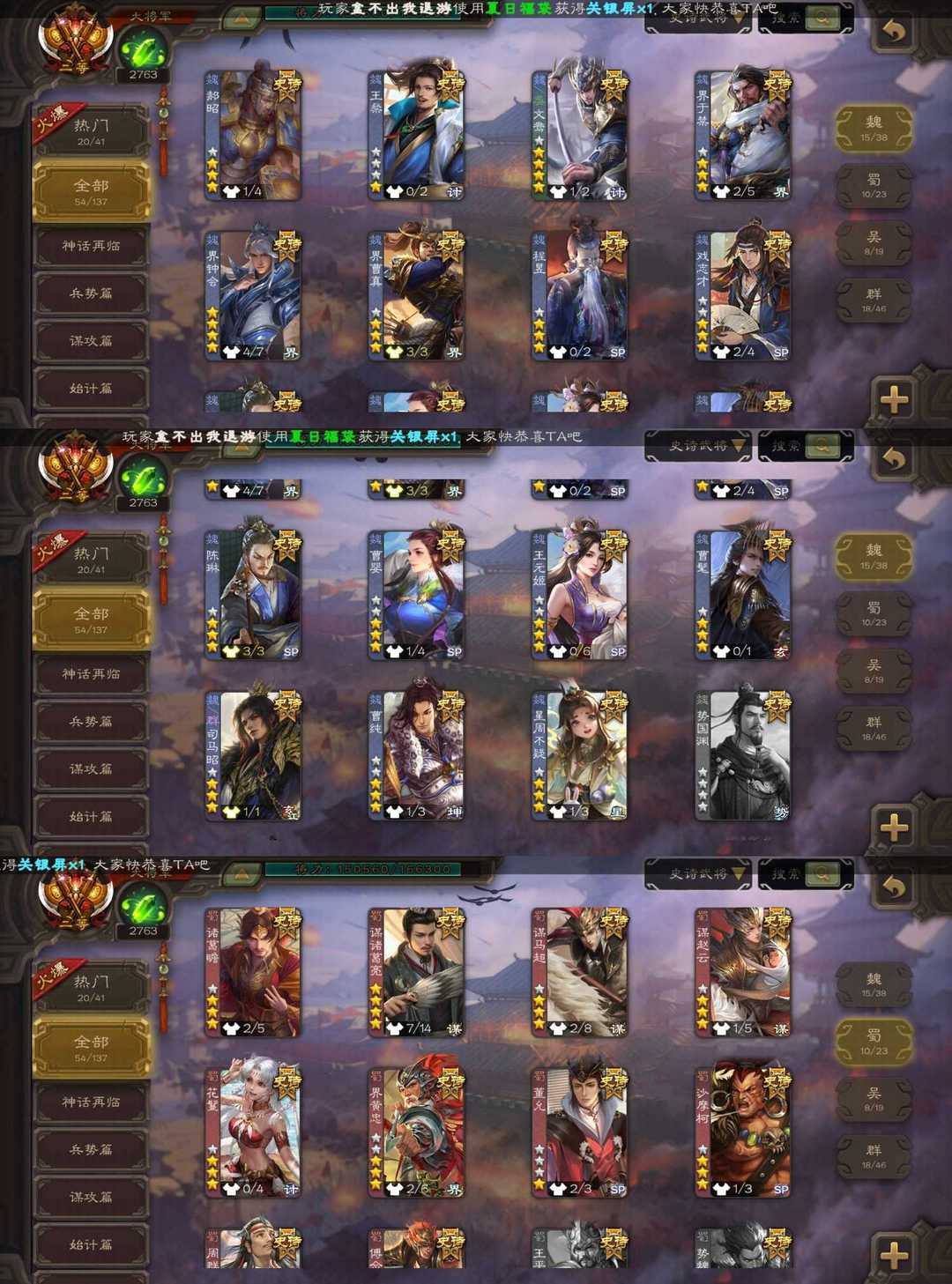 装备描述:魏:双形态文鸯双形态界钟会 戏志才 曹髦 曹婴 双形态司马昭 蜀:谋诸葛亮 傅佥 吴:势太史慈 天子令谋孙策 留赞 界徐盛 群:谋张角 动态杜预 南华老仙 神:动态神司马懿 神甘宁
